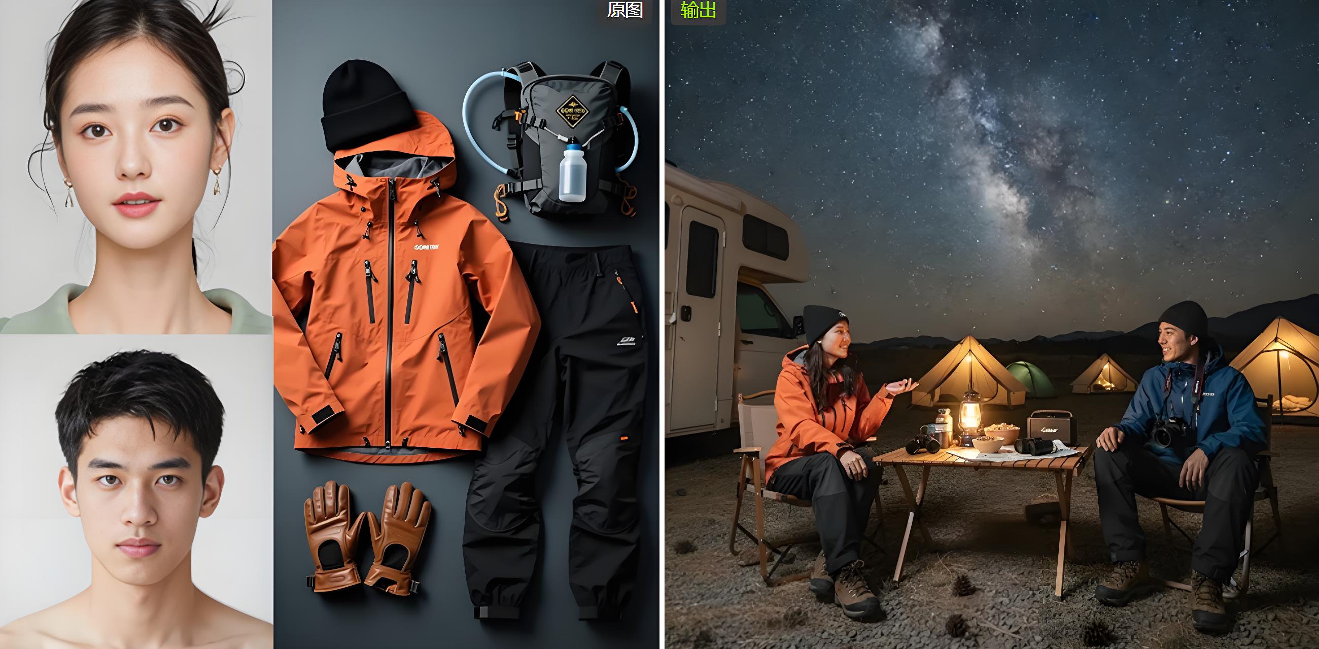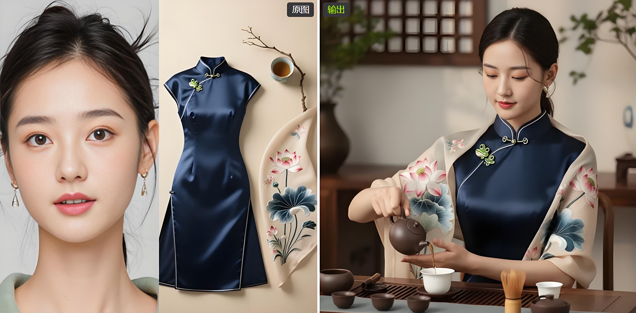 通过上传模特照片和衣服图片,一句话描述,让模特更换服装,一键生成试衣图